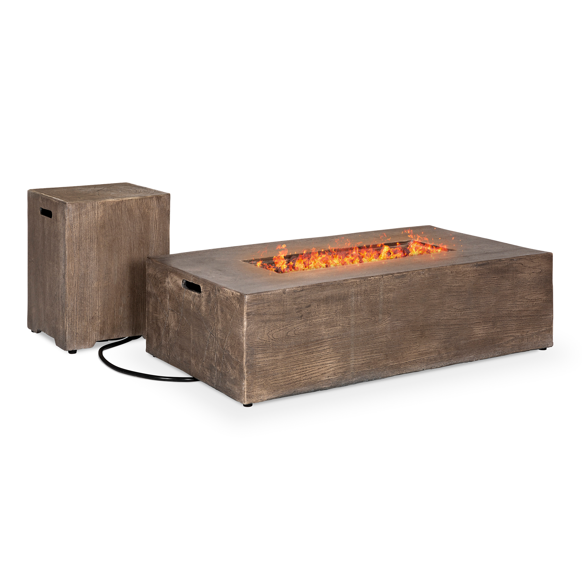 The sleek base houses an enclosed cabinet to hide that propane tank.